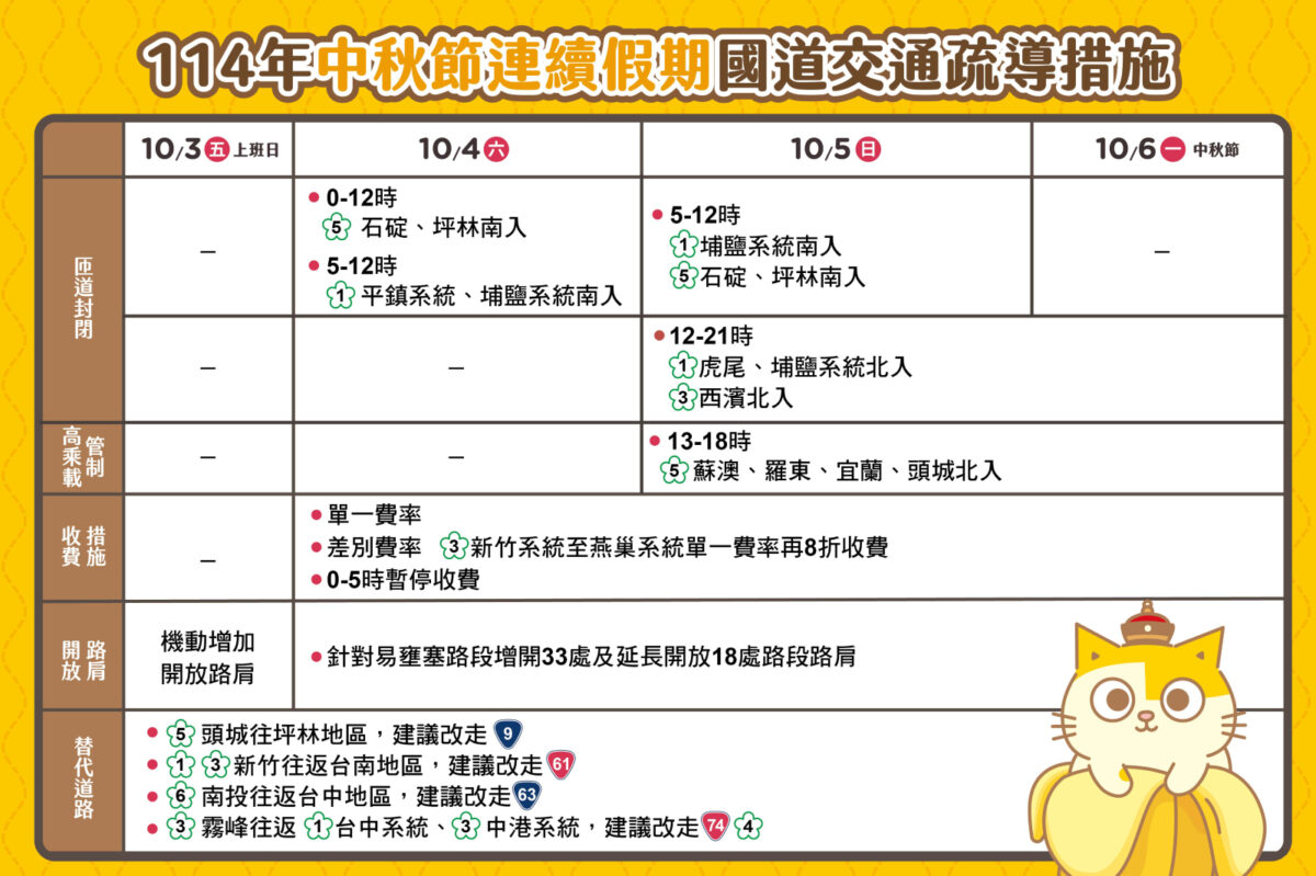對於經常性雍塞路段及假日運作狀況不佳之匝道,高公局也宣布中秋節連假期間執行匝道封閉,減少匝道車流匯入主道影響。連續假期之每日匝道封閉情況不同,管制規劃如下: