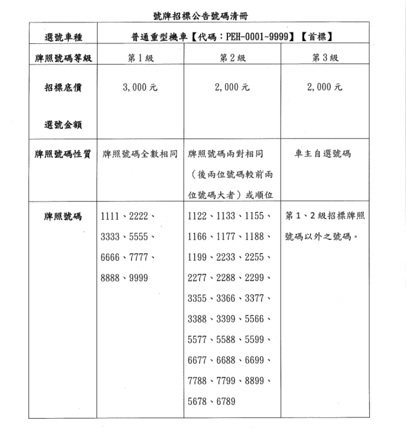 監理站提醒,詳細的標售號碼、競標條件、作業規定、投標金繳交方式及領牌流程,皆可至監理服務網查詢。李健新鼓勵車主踴躍參與,但他也補充,普通重型機車部分,第一級、牌照號碼全數相同 (鐵支牌) 招標底價3,000元,第二級牌照號碼兩對相同 (如5566、3344等) 底價2,000元,第三級之自選號碼則為底價2,000元。