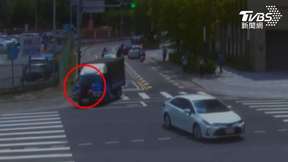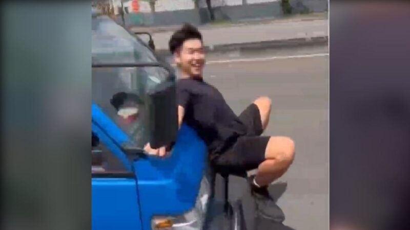 據了解,上月12日上午10時許,一輛藍色小貨車行經新月三街右轉中正路時,有一名男子竟直接站在車頭保險桿上。畫面中顯示,男子手拉後照鏡、腳踩保險桿,整個人貼在行進中的貨車前,還時不時嘻笑,行為相當危險,也讓旁人看傻眼。