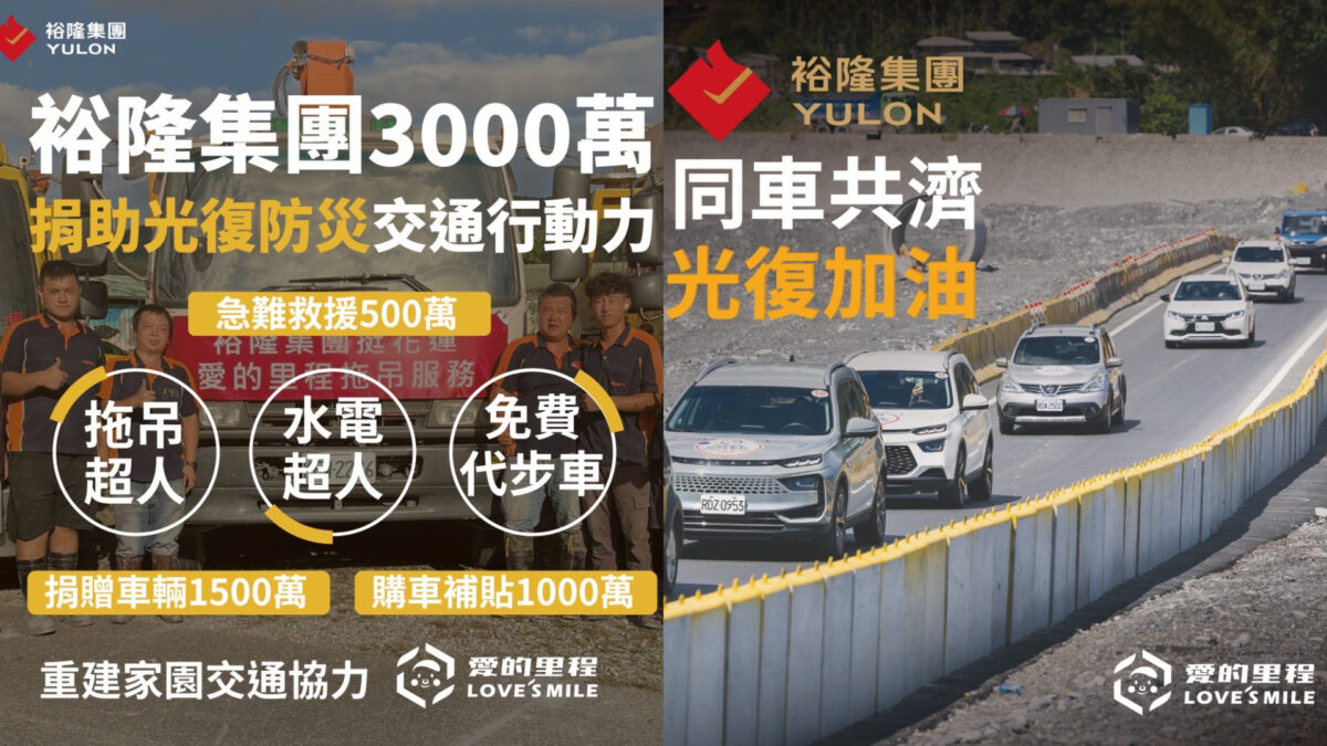 裕隆集團愛的里程公益平台長期致力於社會交通韌性的建立,集團此次攜手裕隆汽車、中華汽車、台元紡織、裕融企業,發揮汽車產業的核心能力,投入「花蓮光復災後重建行動力計畫」實質捐助3,000萬元,由集團旗下中華汽車支應1,000萬元 (捐贈車輛/災民優惠購車方案)、裕隆汽車捐助1,000萬元 (捐贈車輛/災民優惠購車方案)、台元紡織500萬元 (捐贈車輛)、裕融企業500萬元 (捐助格上移動服務方案:拖吊、代步車等)。