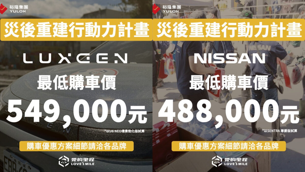 此外,鑒於花蓮光復鄉洪災造成大多數民眾車輛泡水報廢,未來仍有交通購車需求,裕隆集團旗下中華汽車、裕隆汽車、台元紡織提撥1,500萬元,用以實質捐贈,預計捐出15台集團品牌車款,同時,中華汽車、裕隆汽車也提撥專款1,000萬元,提供光復鄉受災車主選購中華三菱、NISSAN車系以及LUXGEN車系的的專屬優惠購車方案。補助災民中華三菱最低購車價近33萬,NISSAN最低購車享48.8萬,LUXGEN購車最低價54.9萬,協力降低災民移動上的負擔。
