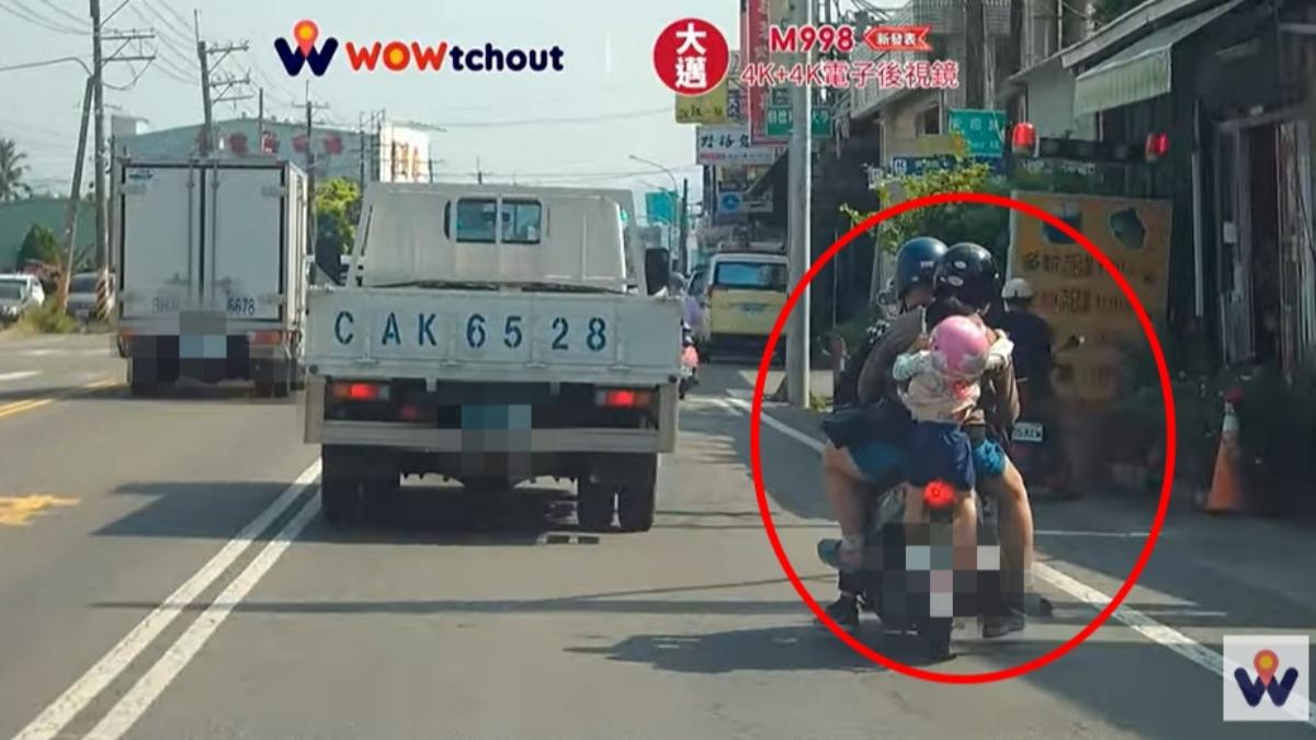 日前有名網友開車行經高雄安招路時,發現前方一對夫妻騎車,媽媽則以背袋揹著小孩,不過仔細一看,孩子全身竟懸掛在機車坐墊外頭;雖戴著安全帽,仍緊抓著媽媽的背不放,場面相當驚險。過程中,還有一名好心騎士撿起孩子掉落的鞋子,返還給騎士一家。