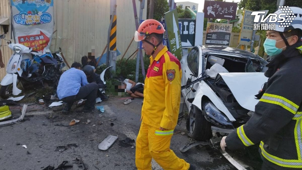 【記者徐郁惇、攝影葉奉達、李讚盛報導】6號下午4點多,屏東恆春發生一起死亡車禍,一輛特斯拉不明原因,高速衝撞水泥預拌車後,波及到路口待轉區等紅燈的4貼機車,導致1死7傷,而這部特斯拉,是駕駛租來的,他載著妻子和一對雙胞胎兒女南下遊玩,卻意外喪命,警方還要持續釐清事故原因。
