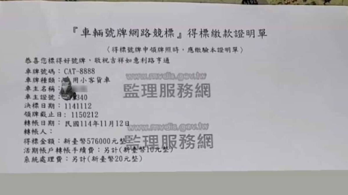 等他的藍寶堅尼或麥拉倫正式掛上「CAT-8888」後,這張牌大概會成為全台最有故事的貓咪車牌,也讓這場競標變成2025年最可愛、最療癒、也最熱血的汽車話題之一。