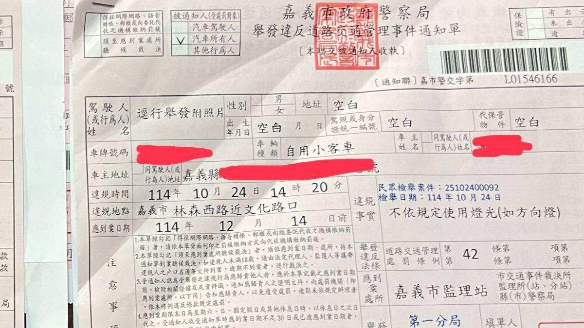嘉義市因應車流量提升,將多條2線車道於重要路口增設「左轉專用車道」,但由於道路寬度未擴增,導致直行車輛需配合車道線「斜行」才能維持直行。謝姓民眾在10月24日下午2點20分行經林森西路、文化路口時,因斜行未打方向燈遭檢舉,收到1200元罰單,他隨後左轉時遇僅3秒黃燈,反應不及再被開出3000元闖紅燈罰單,合計短短1分鐘內連吞2張罰單,損失高達4200元。