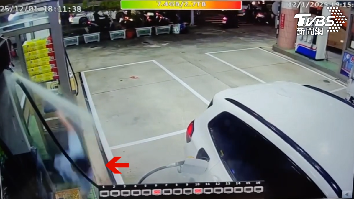 事件發生於12月1日傍晚6點多,一名加油站員工剛將油槍插入白色休旅車的油箱、啟動加油流程,油槍上方管線便突然從接縫處爆開,汽油像加壓水柱般不受控制狂噴。