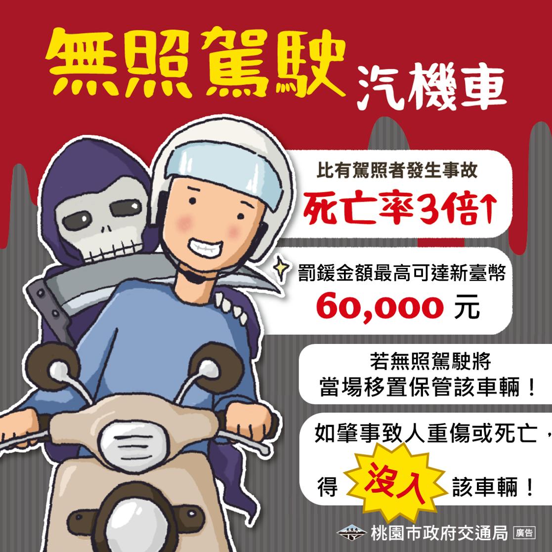 桃園市交通局表示,立法院近期針對無照駕駛罰鍰修法,罰鍰金額大幅提升。機車無照駕駛罰鍰提升至1萬8千元至3萬6千元,小型車則為3萬6千元至6萬元。若為汽機車駕駛於10年內違規2次以上,將以該車種最高罰鍰處罰;第3次以上還需再加罰12000元。所有無照駕駛者,均應當場移置保管車輛,若肇事致人重傷或死亡,將沒入汽機車。