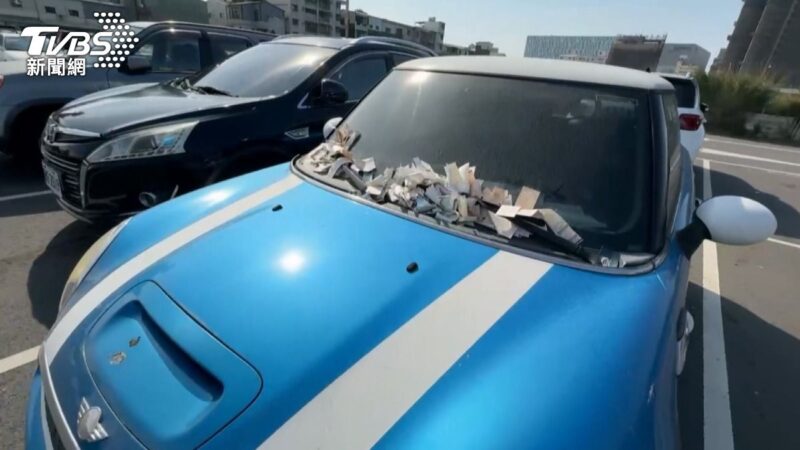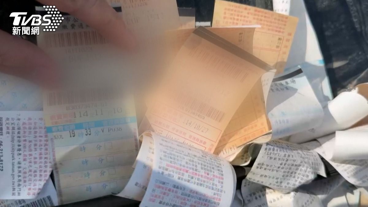 這輛藍色掀背車停放在台南東區的公有停車場內,吸引了路過民眾的注意。車輛前擋風玻璃夾滿了繳費單,有些已經褪色泛黃,數量多到難以計算。仔細查看繳費單可發現,大多是114年開立的,最新的一張日期為12月5日。除了繳費單外,車窗上還被貼上當鋪貼紙,整輛車布滿灰塵,明顯長期未被使用。