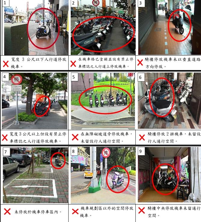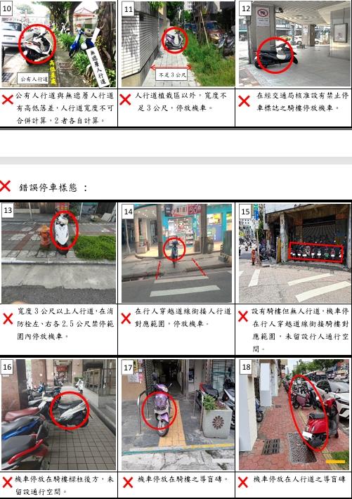 - 寬度3公尺以下人行道禁止停車,機車可停放於寬度3公尺以上騎樓。