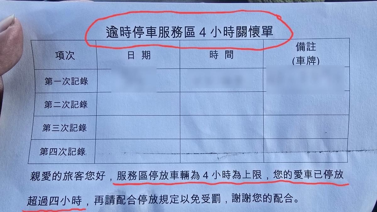車主在臉書社團「車床天地」指出,自己停在國道服務區停車格,並躺在車上睡覺,沒想到一起床就看到窗前夾了一張「逾時停車服務區4小時關懷單」。
