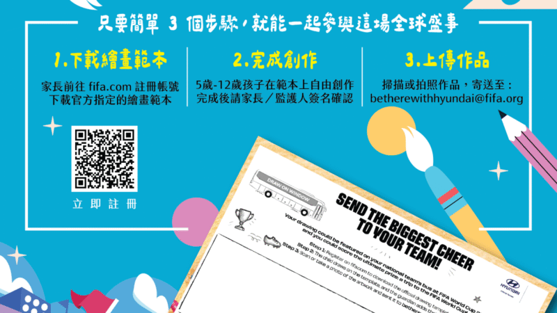 - 世界盃官方曝光|入選作品將呈現在國家隊官方巴士,每支參與國家隊將選出一件優勝作品,展示於賽會期間接駁球員的官方巴士上,讓孩子的應援一路陪伴球隊前進。