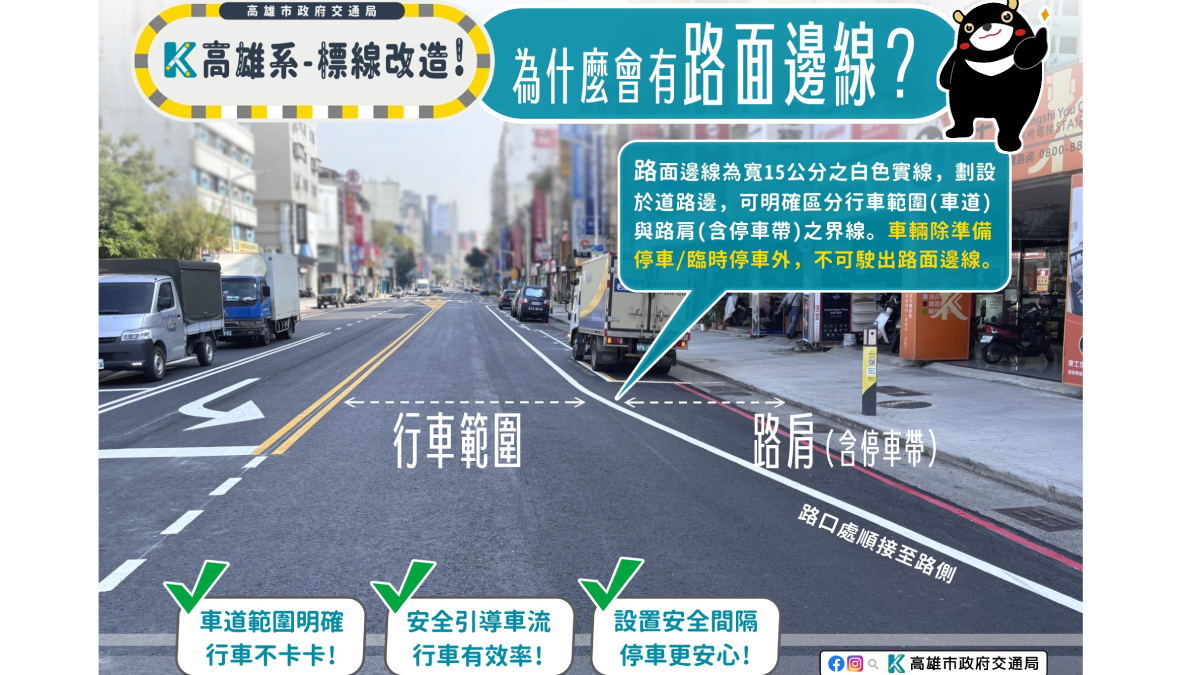 高雄市為提升行車安全與交通順暢,近期持續推動「道路標線改造」。其中,新鋪設馬路邊緣的15公分白色實線,即路面邊線,用以區隔行車範圍與路肩。然而,過去曾發生騎士誤以為路肩可供行駛,因而釀成交通事故的案例。對此,依照《道路交通管理處罰條例》第45條規定,若用路人若任意駛出路面邊線,或跨越既定車道行駛,將處以新台幣600元至1,800元罰鍰。