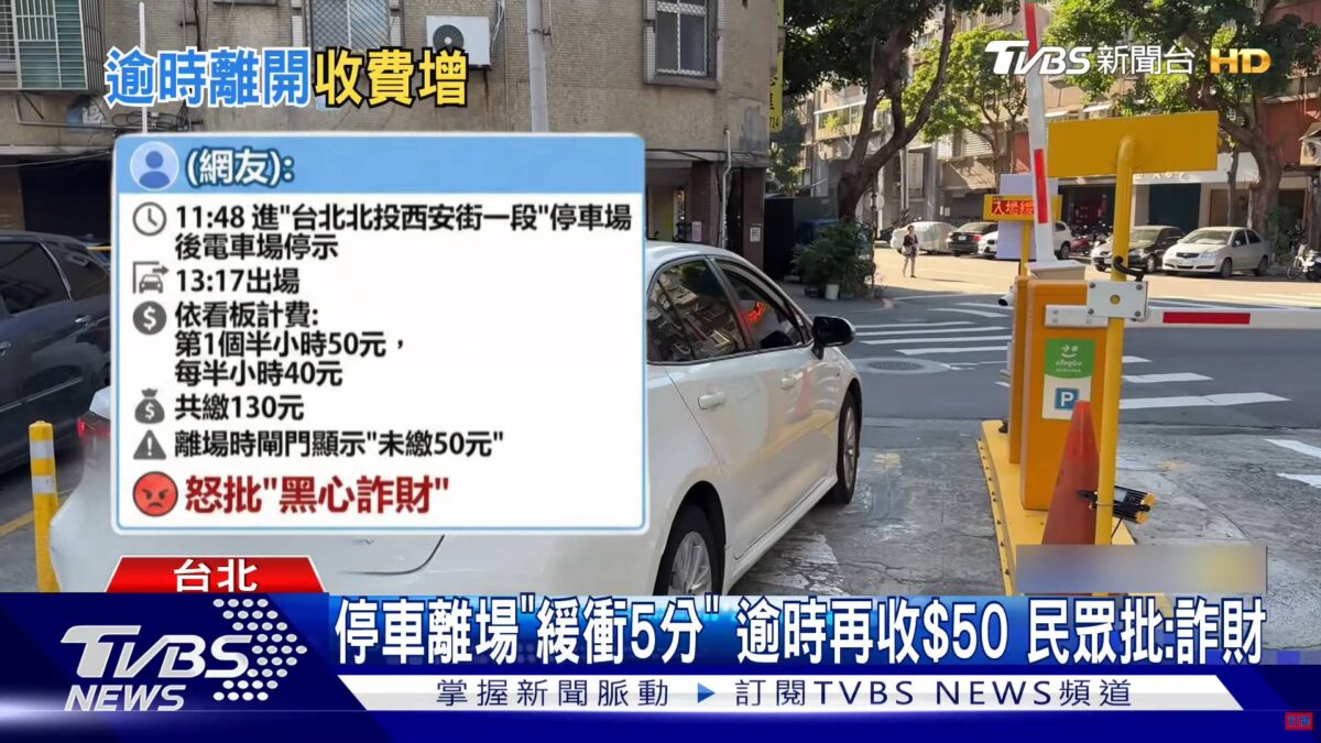 一位民眾表示,他在11:48停進台北北投西安街一段的停車場,13:17出場時依照看板計費標準繳了130元(第一個半小時50元,之後每半小時40元)。然而,當他準備離場時,閘門顯示「未繳50元」,原因是他沒有在繳費後5分鐘內離場,因此被重新計費第一個半小時的費用。這位民眾憤怒地批評這種做法是黑心詐財。