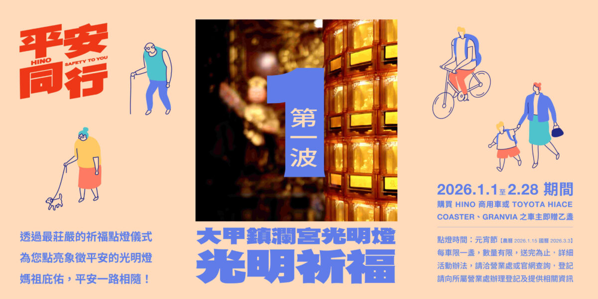 首波行動,和泰商用車以實際回饋感謝車主長期支持。本次「大甲鎮瀾宮光明燈祈福」活動自 2026 年 1 月 1 日起至 2 月 28 日止。凡於活動期間購買 HINO 商用車及 TOYOTA COASTER、GRANVIA、HIACE 之車主,即贈送「大甲鎮瀾宮光明燈」乙盞。符合資格之車主,須向所屬營業處辦理登記。光明燈將於元宵節(農曆正月十五,2026 年 3 月 3 日) 正式上燈。上燈後,鎮瀾宮誦經團將於農曆每月初一及十五,為燈主恭誦經文、祈福祝禱,象徵全年平安,守護車主每一趟行程安心出發、順利返程。