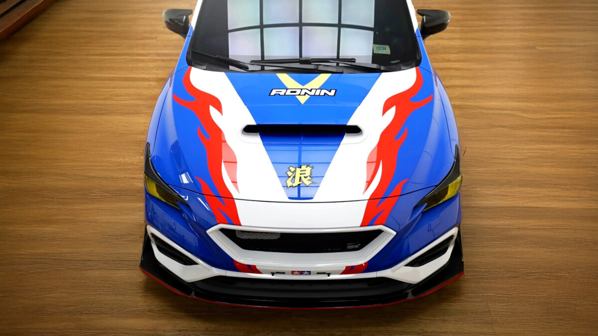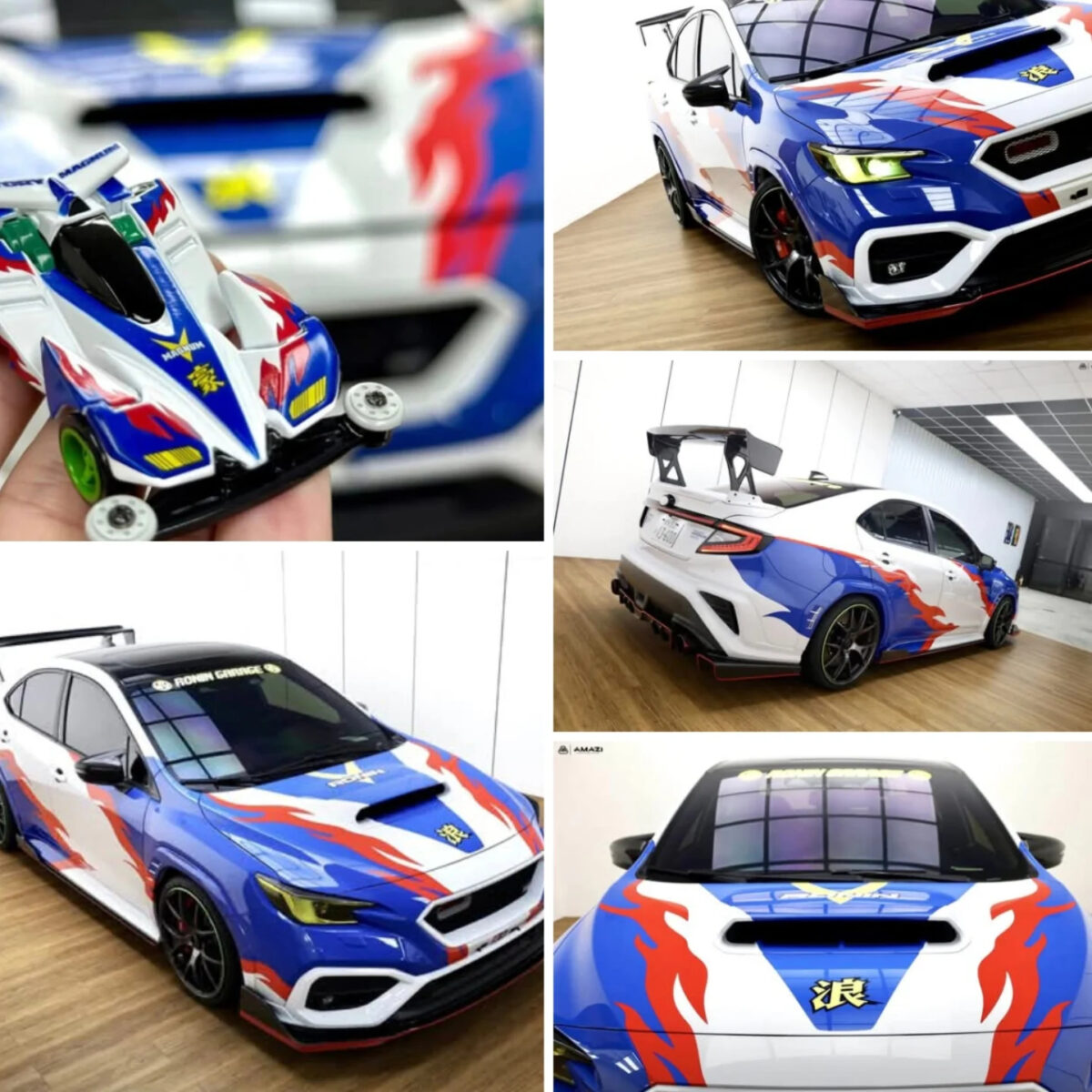 耗費不少時間,車主特別將WRX還原成《爆走兄弟》、星馬豪同款的「勝利衝鋒」號,不僅完整移植了藍、白色的車身塗裝,輪框部分也特意換成亮綠色呈現,甚至燈殼也如同動畫中的四驅車使用黃色點綴。細節部分,勝利衝鋒原先在車頭有「豪」象徵身分,車主也進一步將WRX注入「浪」字,作為自己的愛車識別。