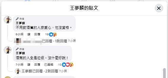 此外,這起酒駕恐怕讓家庭關係亮起紅燈,王夢麟的女兒於 (1月1日) 晚間透過王夢麟臉書毫不留情地怒斥父親的行為,甚至在留言處寫下「酒駕的人全是垃圾」等重話,展現大義滅親的態度,要父親好好面對錯誤。對於父女關係是否因此陷入緊繃,王夢麟不願多做回應,僅低調表示謝謝各界關心,目前將專心等待法院通知。
