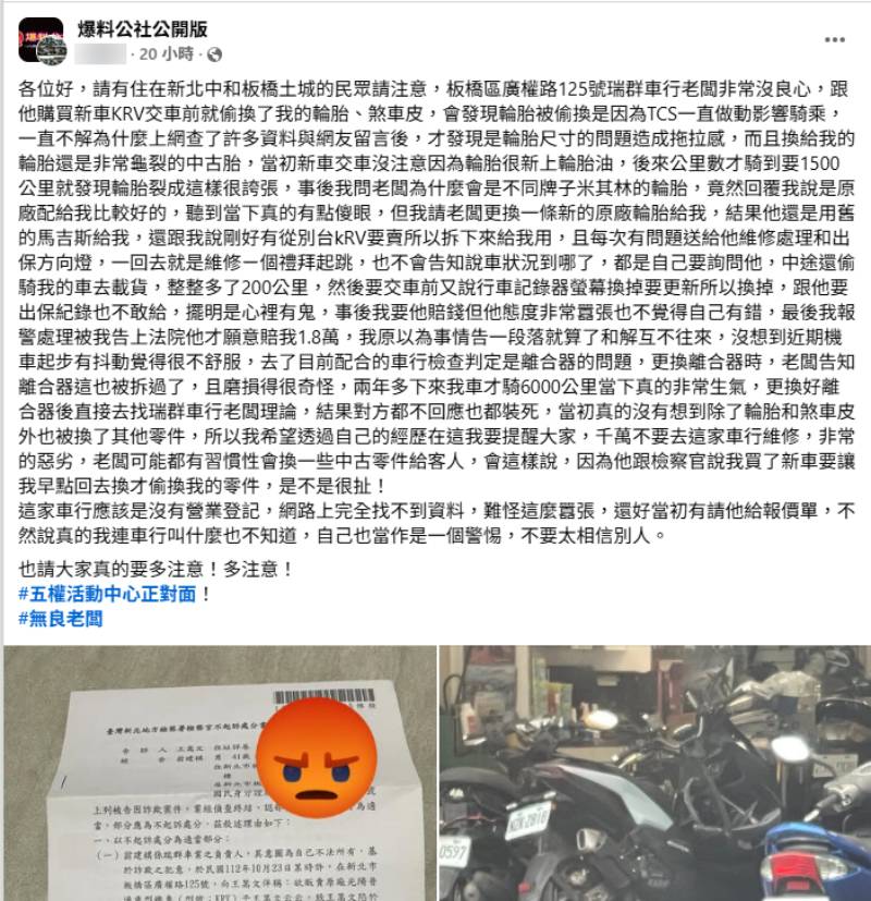近日一篇出現在臉書「爆料公社公開版」的貼文引發不少機車族關注,一名網友控訴,自己在2023年10月23日於新北市板橋區某機車行,花了11.98萬購買全新Kymco RomaGT旗艦運動速克達,卻疑似在交車前遭車行私下更換輪胎、煞車皮,甚至連離合器都可能被動過手腳,事後還衍生出維修拖延、私自使用車輛等爭議,最終甚至走上報警與司法途徑,雖然當時以和解結案,沒想到最近才發現更離譜的問題。