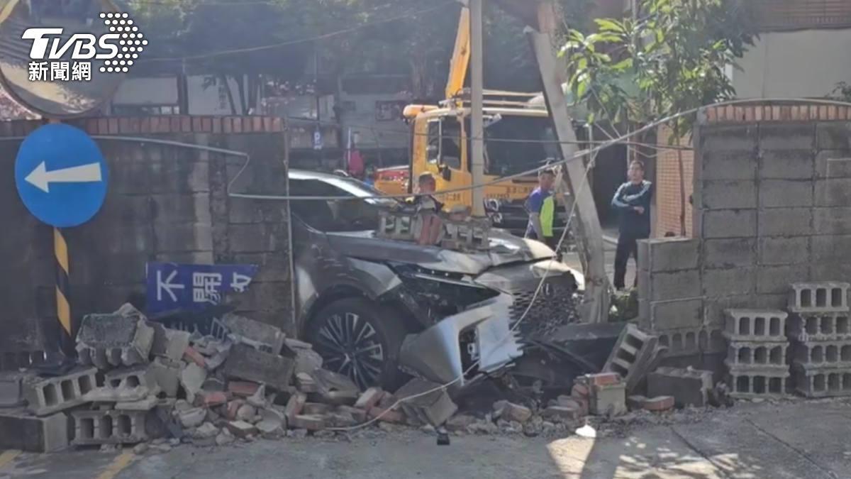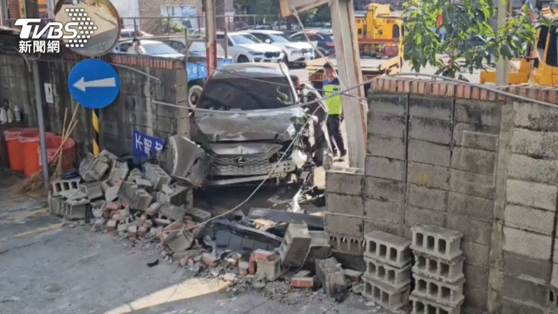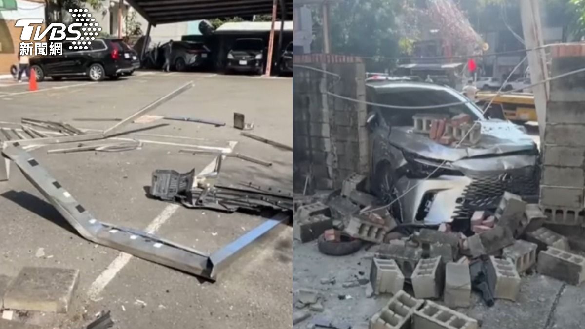 遭撞擊後,Lexus RX瞬間向前暴衝,接連撞上停車場鐵門與圍牆,整面圍牆應聲倒塌,磚塊散落滿地,部分碎石更噴飛至隔壁的都發局都市修復工程科辦公區域。