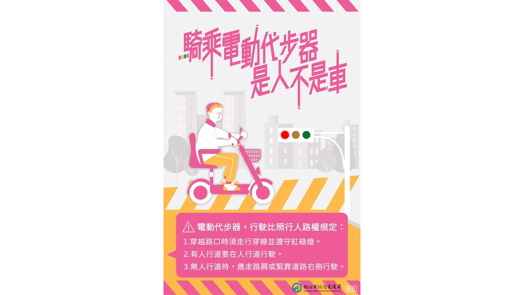 事實上,醫療用電動代步車被列為個人行動輔具,不需申請牌照、掛車牌,也不需要駕照,其管理規範完全與行人相同。因此,依《道路交通管理處罰條例》第78條若不在劃設之人行道通行,或無正當理由,在未劃設人行道之道路不靠邊通行,將處新台幣500元罰鍰。新北市交通事件裁決處處長李忠台也提醒,若遇到人行道施工或障礙物而不得不進入車道時,必須緊貼路邊行進,絕對不可貪圖方便而橫行於路中央,以免將自己置於險境,也危害到其他用路人的安全。