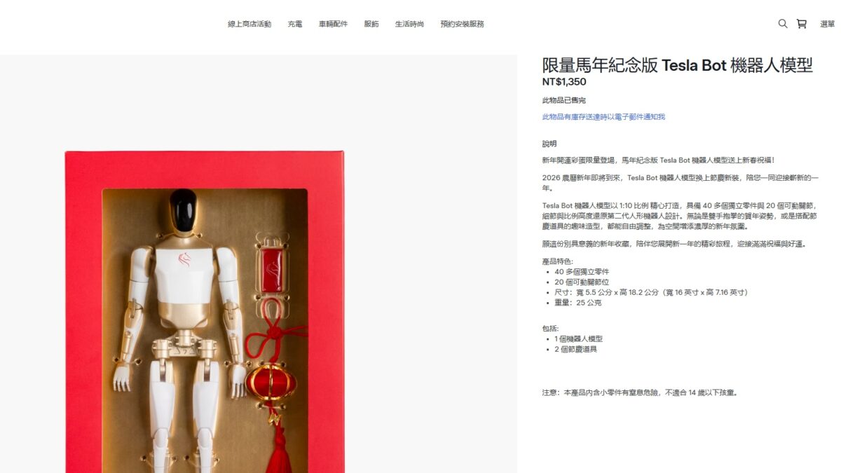 隨著2026農曆新年即將到來,特斯拉近日很應景地推出限量「馬年紀念版Tesla Bot機器人模型」,以自家人形機器人Optimus為原型打造,結合馬年的限定設計元素,一上架就引起特斯拉粉絲關注,而台灣也在開賣後沒多久公告完售,售價跟一般版本一樣訂在1,350元,但除了模型配色不同外,原本的充電座支架跟CyberHammer模型,也被換成新年限定的節慶道具。