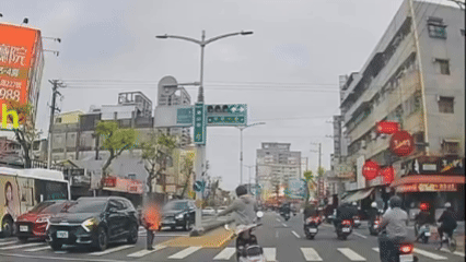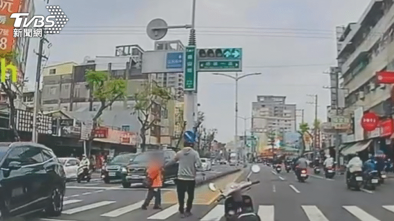 事發當時,車流繁忙的路口處,一名身穿橘色上衣的行人正在穿越馬路,由於行動較為不便,走到斑馬線中間時,行人號誌綠燈突然轉為紅燈,情況相當危險。後方一名機車騎士見狀後,隨即將車輛停下,快步走向斑馬線中央。