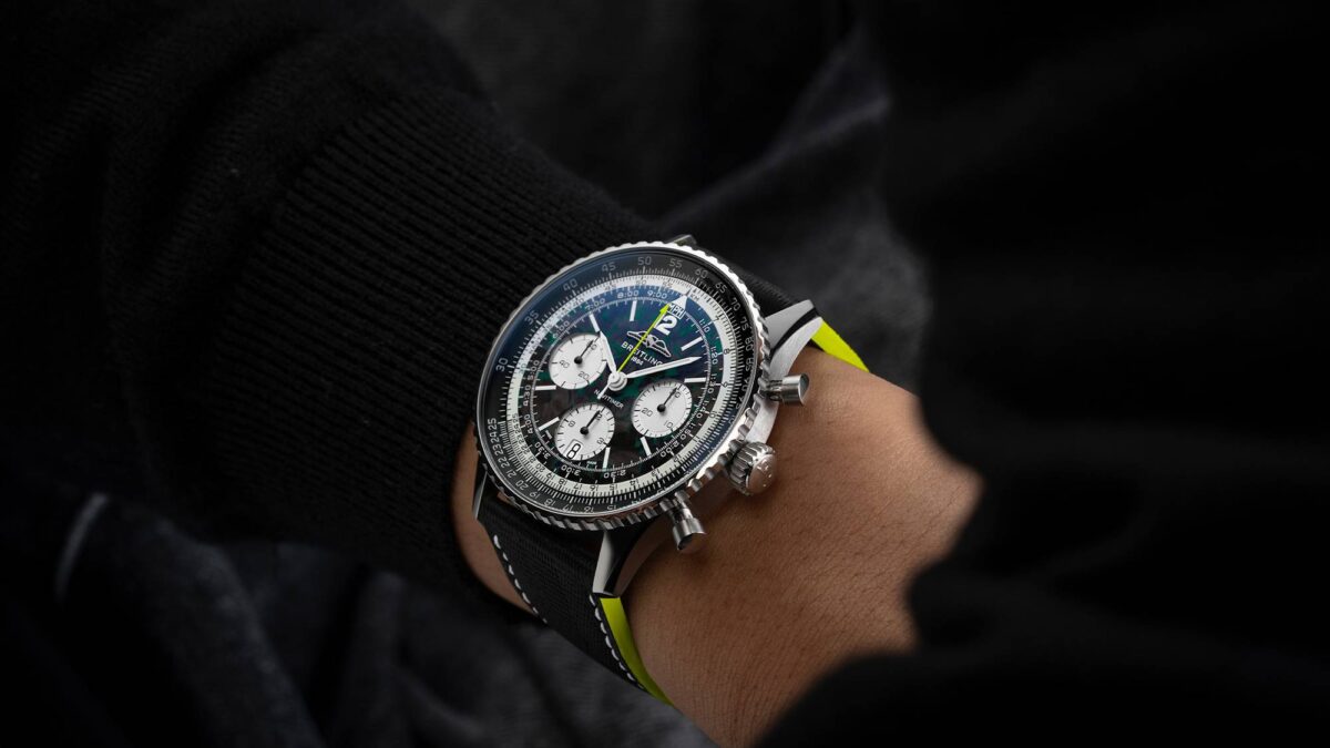這是Breitling首次於Navitimer系列採用鈦金屬錶殼,43mm錶徑在改用鈦材質後有效降低重量,改善過往略顯頭重腳輕的佩戴感,同時保留Navitimer標誌性的滑尺錶圈與複雜儀表風格面盤設計。面盤採用碳纖維質感處理,靈感源自F1賽車駕駛艙材料,並融入Aston Martin Racing Green與萊姆綠點綴元素,呼應Aston Martin Aramco車隊塗裝,白色夜光時標強化夜間可讀性。