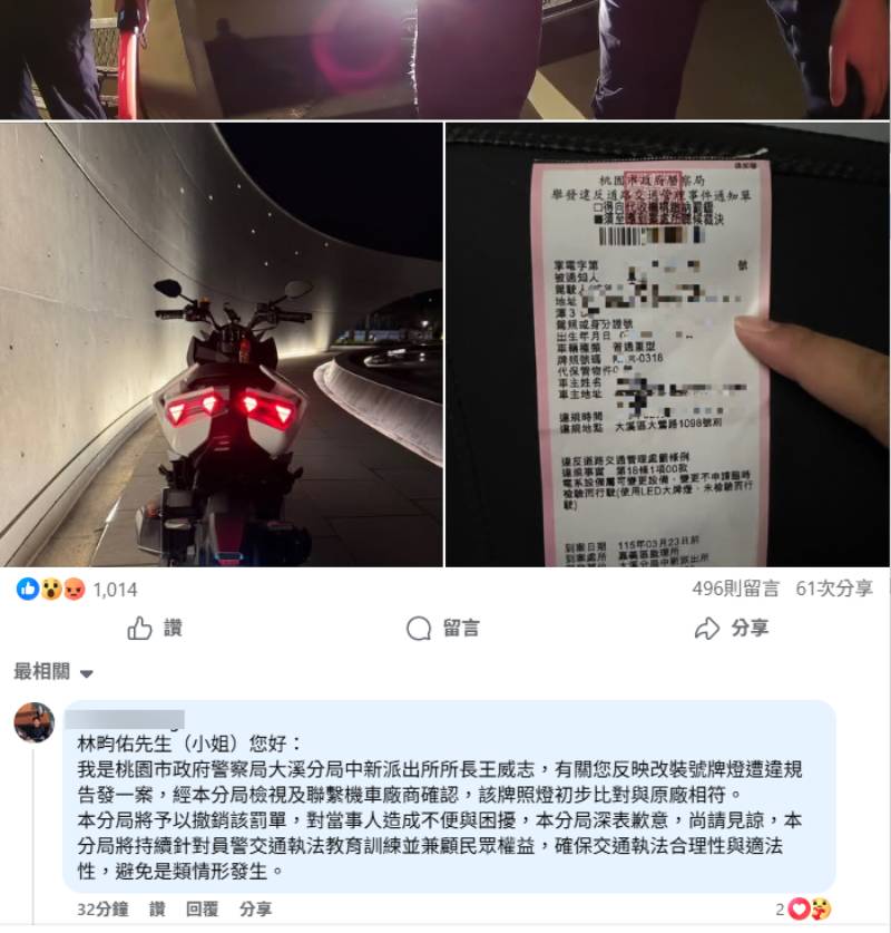 經過網友一陣開轟後,桃園市政府警察局大溪分局中新派出所所長王威志也出面回應,對林姓車主表達歉意:「有關您反映改裝號牌燈遭違規告發一案,經本分局檢視及聯繫機車廠商確認,該牌照燈初步比對與原廠相符。 本分局將予以撤銷該罰單,對當事人造成不便與困擾,本分局深表歉意,尚請見諒,本分局將持續針對員警交通執法教育訓練並兼顧民眾權益,確保交通執法合理性與適法性,避免是類情形發生。」