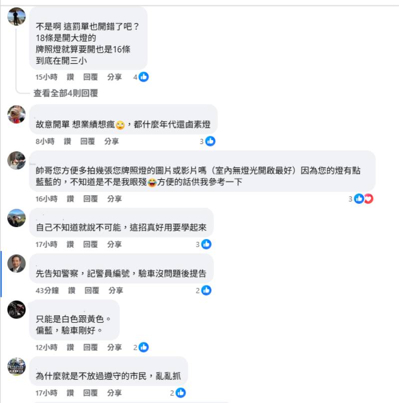 此外,有其他網友表示,即便警察真的有發現牌照燈有違規之處,應該也是以《道路交通管理處罰條例》第16條「除頭燈外之燈光、雨刮、喇叭、照後鏡、排氣管、消音器設備不全或損壞不予修復,或擅自增、減、變更原有規格致影響行車安全」開罰900~1,800元。