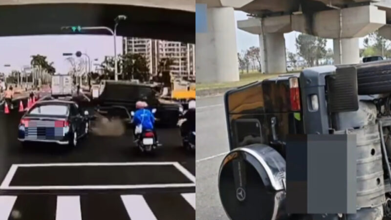 不過,再回看事發瞬間,賓士大G當時沿著高鐵橋下道路行駛,疑似有闖紅燈情形,才會與剛起步通行的小客車發生擦撞,進而造成側翻。所幸這起事故並未造成重大傷亡,未釀成更嚴重後果。目前整起事故的詳細肇事原因與責任歸屬,仍有待警方進一步調查釐清。