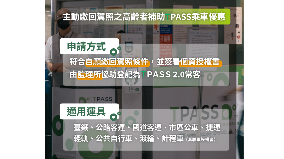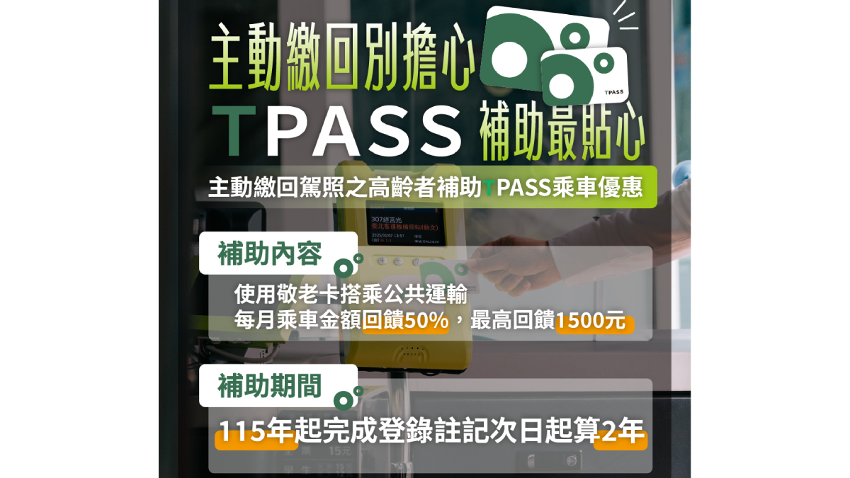 為了鼓勵高齡駕駛人能更輕鬆地適應大眾運輸,交通部自115年1月1日起實施「高齡者自願繳回駕照,即享TPASS乘車回饋」政策,鼓勵70歲以上長者放下車鑰匙、換上電子票證。這項政策不僅守護銀髮族的行車安全,更透過實質的交通補貼,協助長輩在兩年的緩衝期內,輕鬆適應以大眾運輸代步的新生活。