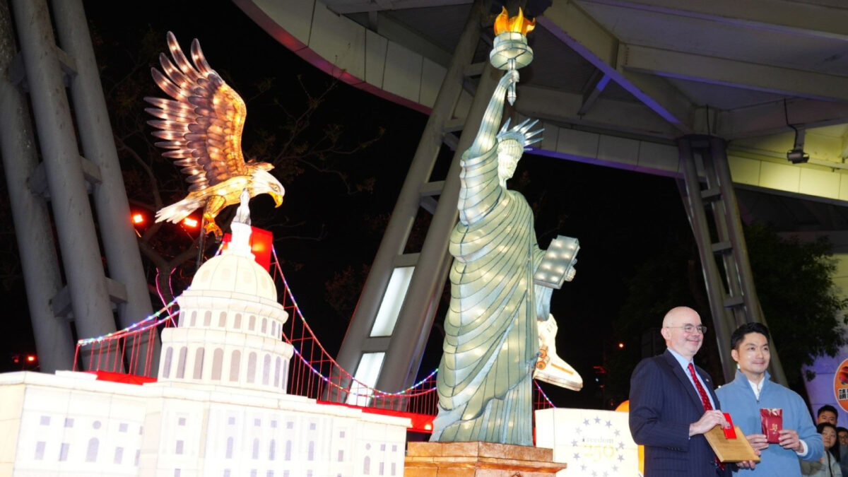 觀傳局說,本次花博展區的友好交流燈區,共邀請13個國家、城市展出特色燈組,今年適逢美國建國250周年,美國在台協會(AIT)更首度參與展出燈飾,展現臺美友好情誼。