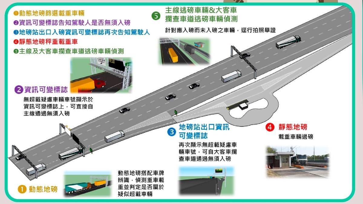 高速公路局自推動動態地磅系統以來,已於國道1號與國道3號主要路段設置13處相關設施,顯著減少大貨車進站等待時間,同時運用AI監測技術,有效提升路面品質及行車安全。2025年3月1日起,國道1號新市北向、國道3號龍潭北向及國道3號龍潭南向三處將加入動態地磅行列,成為科技執法重點區域。
