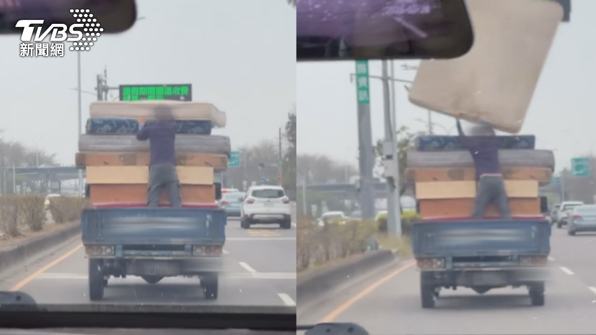 民眾2月28日在台南仁德目擊,有一輛載運的小貨車上竟然站著一名男子,原來這名男子是利用徒手來固定床墊,但場面看起來相當危險,最後,果然出事了。