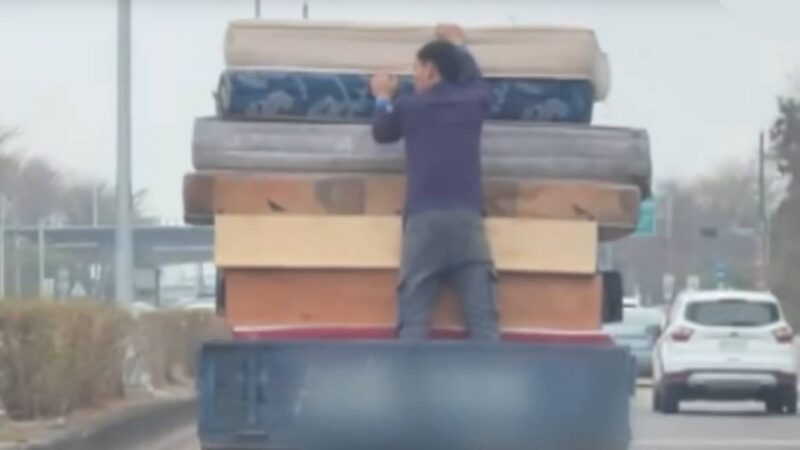 事發當天下午4點多,在台南仁德二仁路二段往南方向,一輛小貨車載運大量床墊行駛中,後方駕駛發現前方景象相當不尋常,仔細一看竟是有人站在小貨車後車斗上,以雙手固定堆疊的床墊。由於貨物疑似未妥善綁牢,駕駛竟採用人力方式固定貨物,場面看起來極為危險。