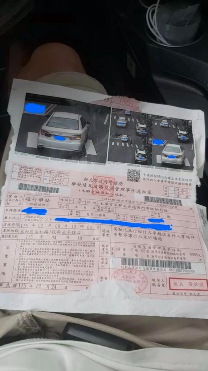 民眾在「台灣罰單/交通/違規 討論區」發文詢問網友的意見,他說自己駕駛轎車行經永和區一處路口時,因為路邊有台車輛違停擋住他的視線,他將車子切內道行駛,開上斑馬線時,同時也有行人踏上。他強調自己車速很慢、後方有行人快步走過斑馬線,卻還是遭開罰6000元,無奈稱連守規矩都這麼難開車,台灣是怎麼了?同時詢問大家是否有機會申訴。