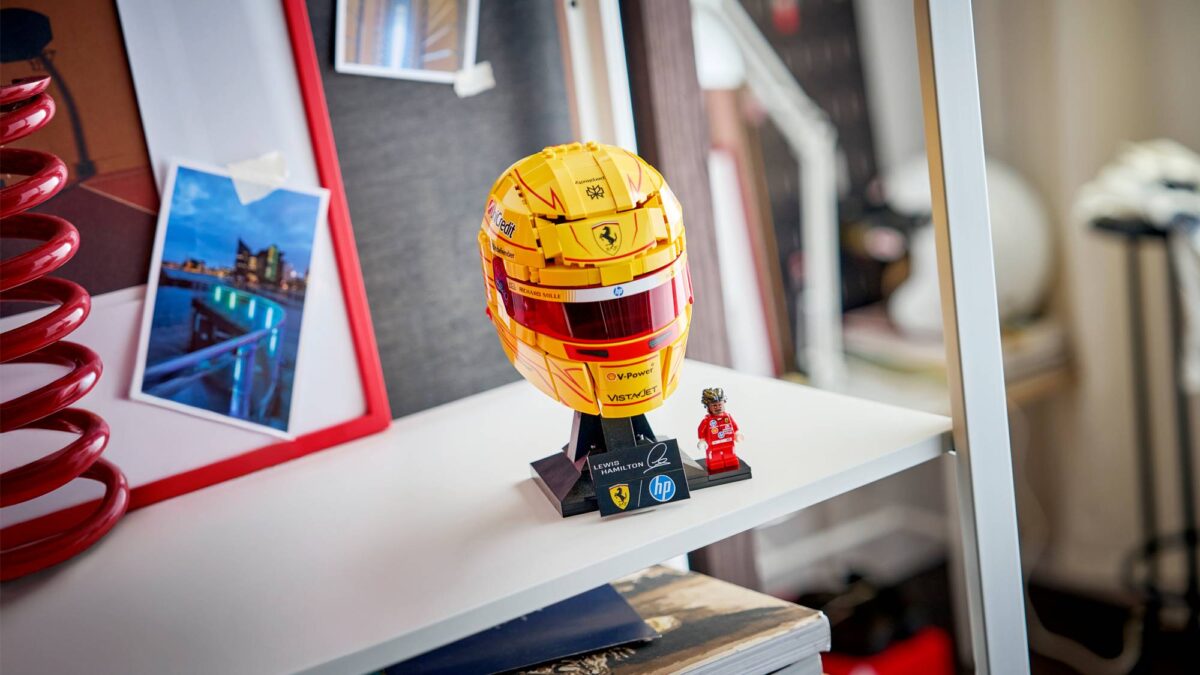 另一款套裝則是Lego Editions Scuderia Ferrari HP Lewis Hamilton Helmet,同樣為高度還原的展示模型。該版本採用法拉利標誌性的Modena Yellow色調打造,並搭配Hamilton安全帽上的個人化圖案與印刷細節,包括他的車手號碼「44」以及專屬圖樣。