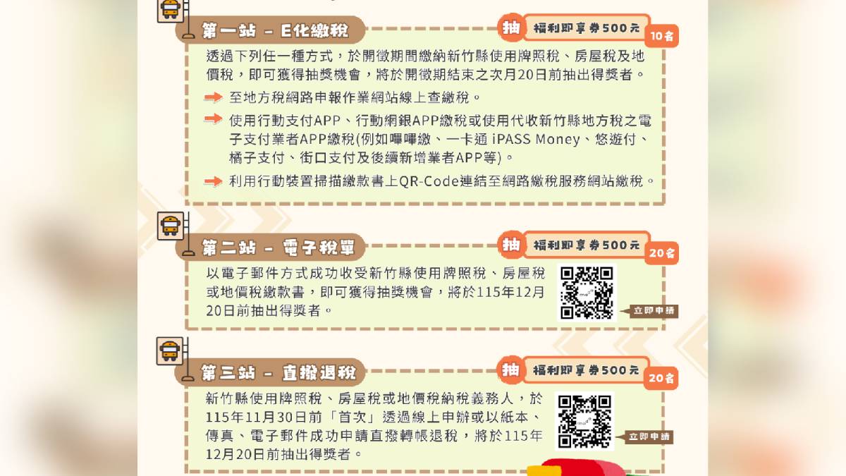 第一站的E化繳稅,民眾利用「地方稅網路申報作業」網站線上查繳稅、行動支付、網銀、電子支付APP或掃描QR-code繳納新竹縣使用牌照稅、房屋稅或地價稅,都有機會獲500元禮券,各稅獎項分別有10名。第二站的電子稅單,以電子郵件方式成功收受新竹縣使用牌照稅、房屋稅或地價稅繳款書,就有機會獲得500元禮券,獎項共計20名。第三站的直撥退稅,在新竹縣使用牌照稅、房屋稅或地價稅納稅義務人首次透過線上申辦或以紙本、傳真、電子郵件成功申請直撥轉帳退稅,都有機會獲500元禮券,獎項共計20名。