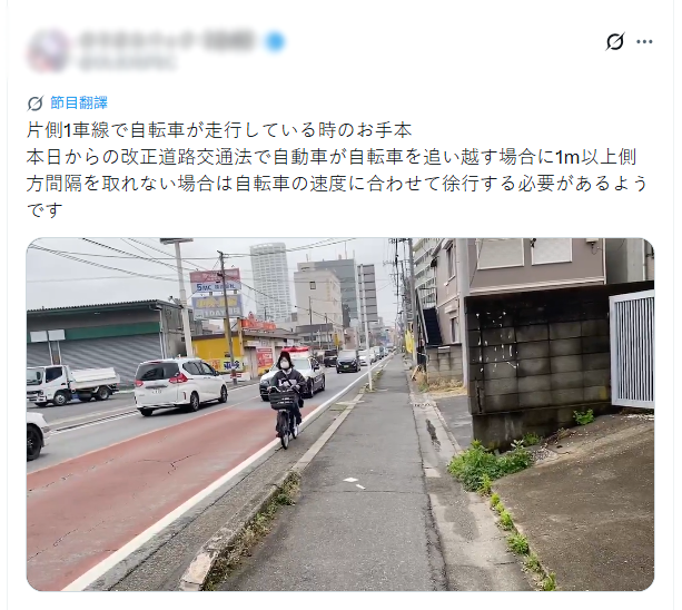 本日からの改正道路交通法で自動車が自転車を追い越す場合に1m以上側方間隔を取れない場合は自転車の速度に合わせて徐行する必要があるようです pic.twitter.com/BkEsYU3gpH