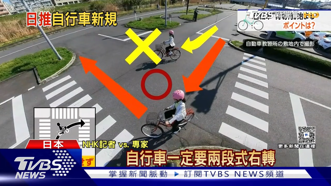 隨著新制上路,日本警方立即在東京澀谷等地舉辦宣導活動。雖然警方表示初期執法會先以勸導為主,但因為法規細節繁多,許多平時不太會注意到的騎行習慣如今都成了違規地雷,不過很意外的是,不少日本人願意回到自行車教室上課。對此,日本當地專家提醒,在十字路口騎車若準備右轉,絕對不能直接切過車道,必須先直行過馬路到對向,轉變方向後再過一次馬路,務必嚴格遵守自行車兩段式右轉的規定。