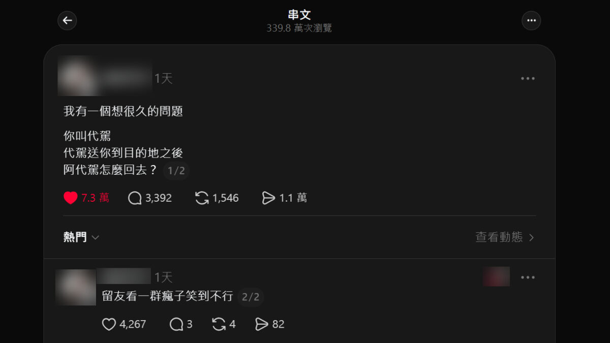 近期有網友對代駕一事感到好奇,發文提到自己一直以來都很納悶,當代駕完成任務、送車主返家或抵達目的地之後,「代駕怎麼回去?」然而,釣出的網友留言沒有一項正經,不只有網友戲稱「當然是車主要再開車載代駕阿」,還有人回覆代駕完成工作、無以返家,其實就是「代駕的代價」,形成一場大型的胡說八道聚會,笑風萬名以上網友。