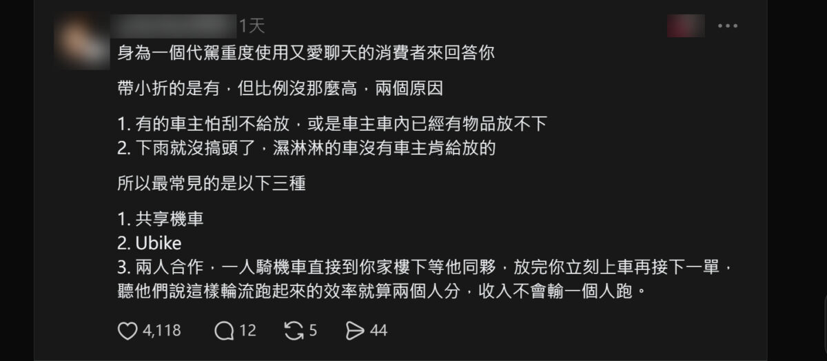 不過,在超過3,000則以上的歪樓留言中,仍有網友針對原Po的疑問認真回覆。有人表示其實代駕以多種方式運作,一種是會自行攜帶通勤工具如電動滑板車、小折,在結束之後離開,又或者是抵達之後另外使用iRent、Wemo、Ubike或GoShare這類的共享運具來通勤。此外,也有人透露許多代駕其實會以兩人一組的方式合作,一人駕駛叫車者的車輛,另一人則駕駛另一台車或騎乘機車接人。