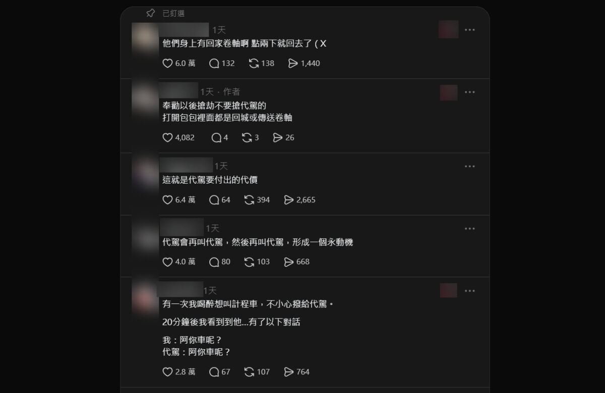 一篇貼文引發轟動,可見網友其實對於這樣的疑問其實相當好奇,而且當中不少人也坦言對代駕的通勤方式抱持疑問。儘管留言一度歪樓,最終仍有網友給出正確回覆,總算是讓代駕這項工作的一部分神秘,得到解答。