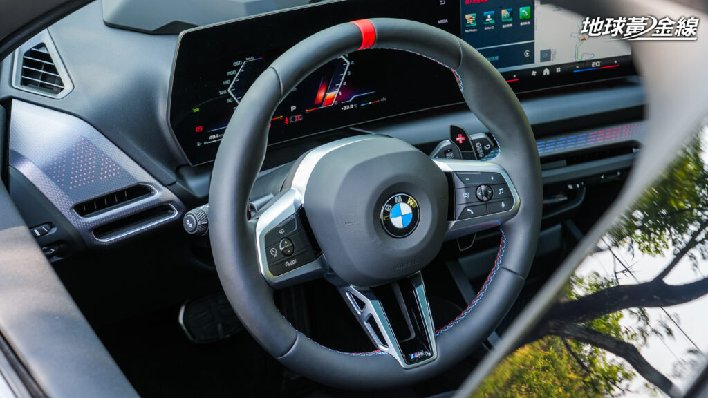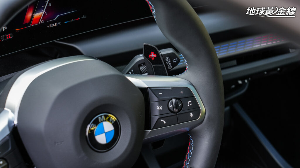 其中,雖然設計樣式與120 M Sport的M款多功能方向盤接近,同樣有鏤空設計的類金屬裝飾與M款標誌,但M135 xDrive使用的版本在12點鐘位置點綴有紅色定位標示,且植入BMW M GmbH三色縫線,甚至還改用更柔軟的包覆,不但讓視覺上的粗壯感加分,也能夠進一步提升抓握感。同時,換檔撥片尺寸亦同步放大,並且導入紅色元素點綴,視覺與操作感受皆同步提升。