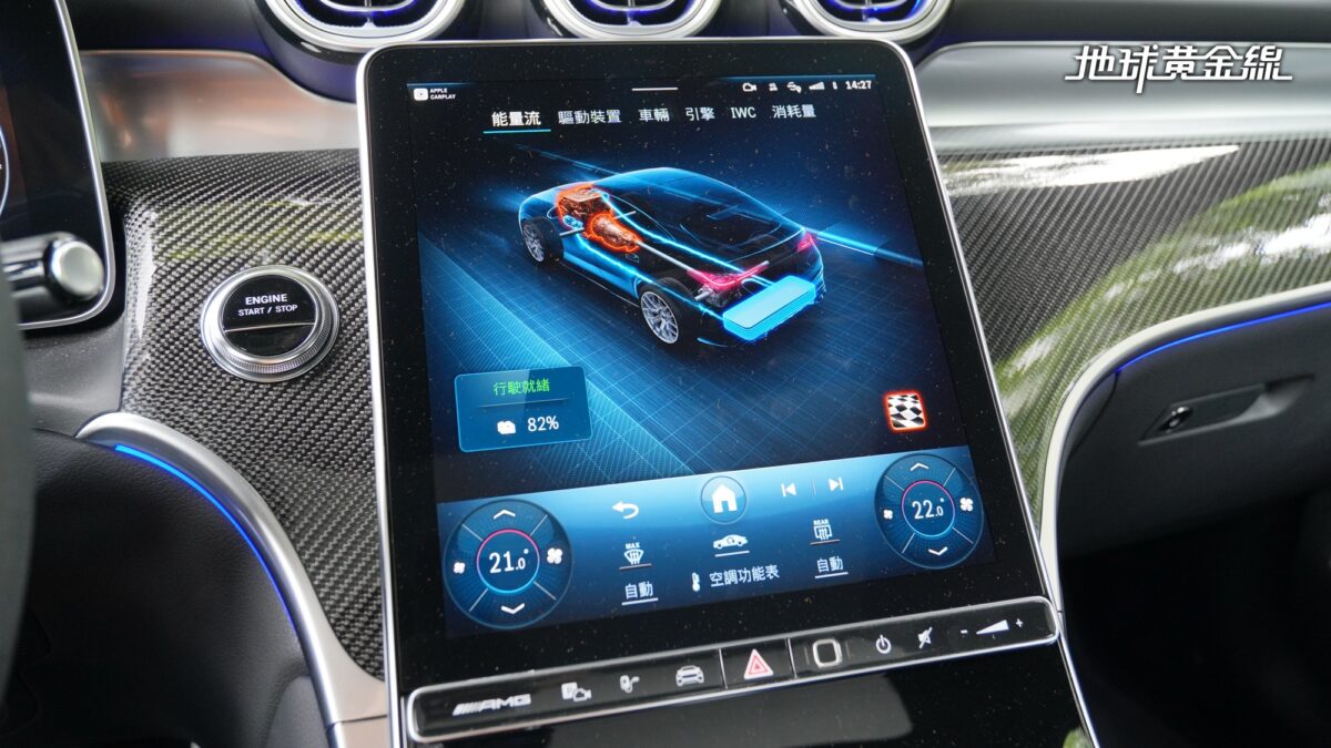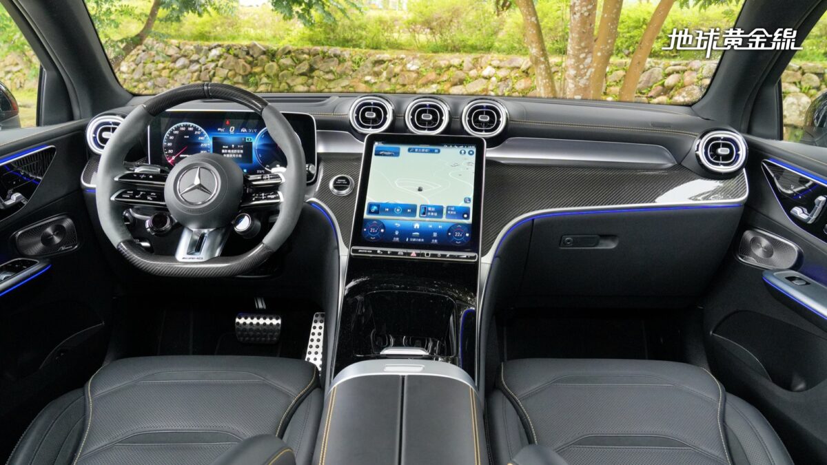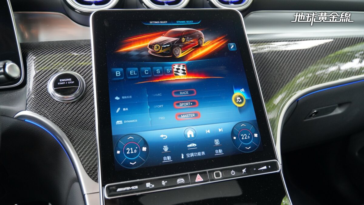 坐進車內可以發現,車上標配的Nappa真皮與Microcut材質交織,方向盤為平底造型,並配有專屬操控旋鈕,握感厚實適中,讓筆者對這組方向盤愛不釋手。中控台搭載11.9吋高解析度觸控螢幕,結合AMG專屬MBUX介面,讓駕駛者能直覺調整各種性能參數。結合選配的抬頭顯示器,駕駛者能即時掌握車輛狀態。