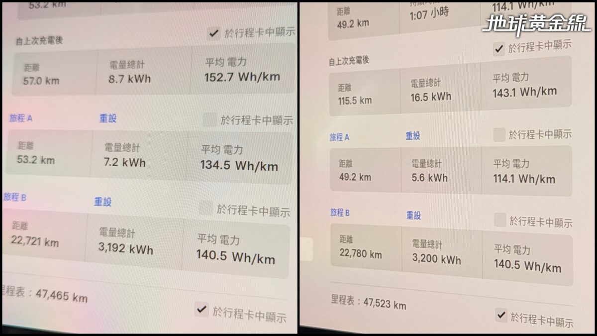 為了觀察Turanza 6裝在電動車上能否減少電耗,出發前我們特地將Model 3的行駛里程與電量統計歸零,簡單測試一下電耗表現。其中去程總共開了53.2公里,行經路段以高速公路跟濱海公路居多,測得平均電耗為134.5Wh/km,總計耗費大約7.2度電。回程總共開了49.2公里,行經路段大多是山路,最終測得平均電耗為114.1Wh/km,總計耗費大約5.6度電,考量到天候不佳、路面溼滑,有這樣的表現其實優於預期,這也代表Turanza 6的低滾阻特性確實能在實際駕駛中發揮節能效果。