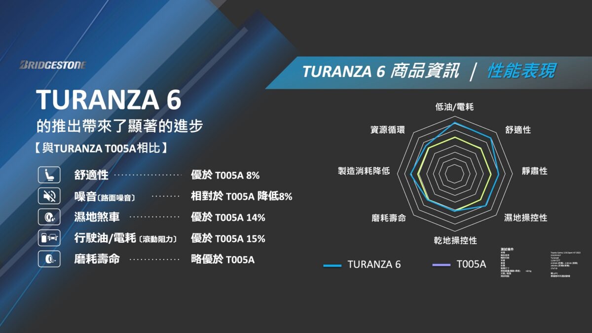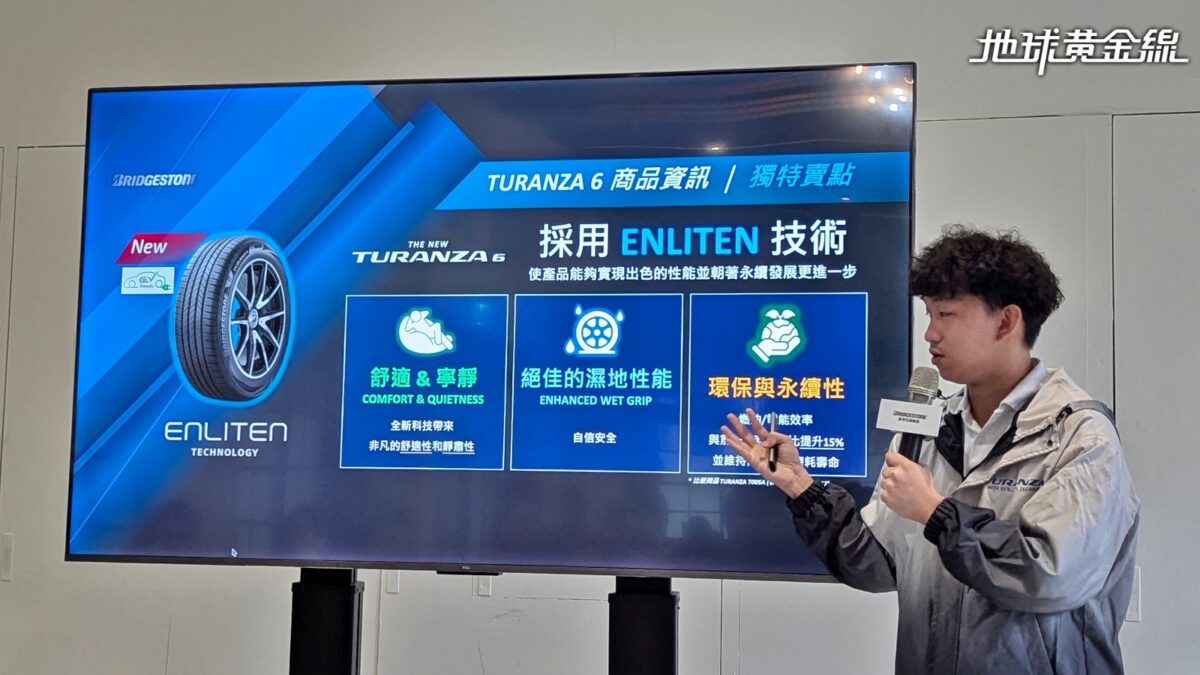 出發之前,台灣普利司通在產品簡報上提到全新Turanza 6有三大技術亮點。首先是導入Enliten創新技術,藉由全新胎形與胎面膠料的結合,使滾動阻力降低達15%,不僅有助於降低燃油消耗,也能對應電動車提升能源效率、延長續航里程,還能減少製造過程與使用階段的碳排放,在追求性能的同時兼顧環保永續。