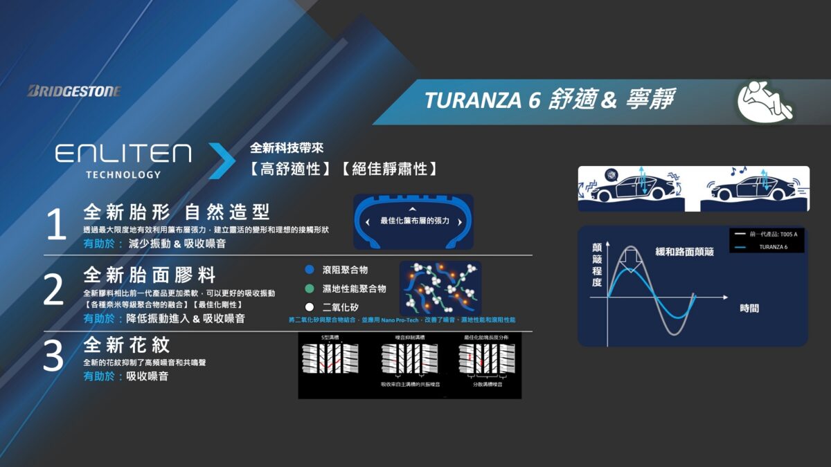 身為普利司通 (Bridgestone) 旗下主打豪華舒適定位的高階胎款,Turanza系列在今年推出全新一代「Turanza 6」,以靜音、舒適、安全與永續為核心開發理念,導入品牌最新Enliten技術,在結構、膠料與花紋設計上全面進化,目標在於提供燃油車與電動車同樣優異的行駛體驗。
