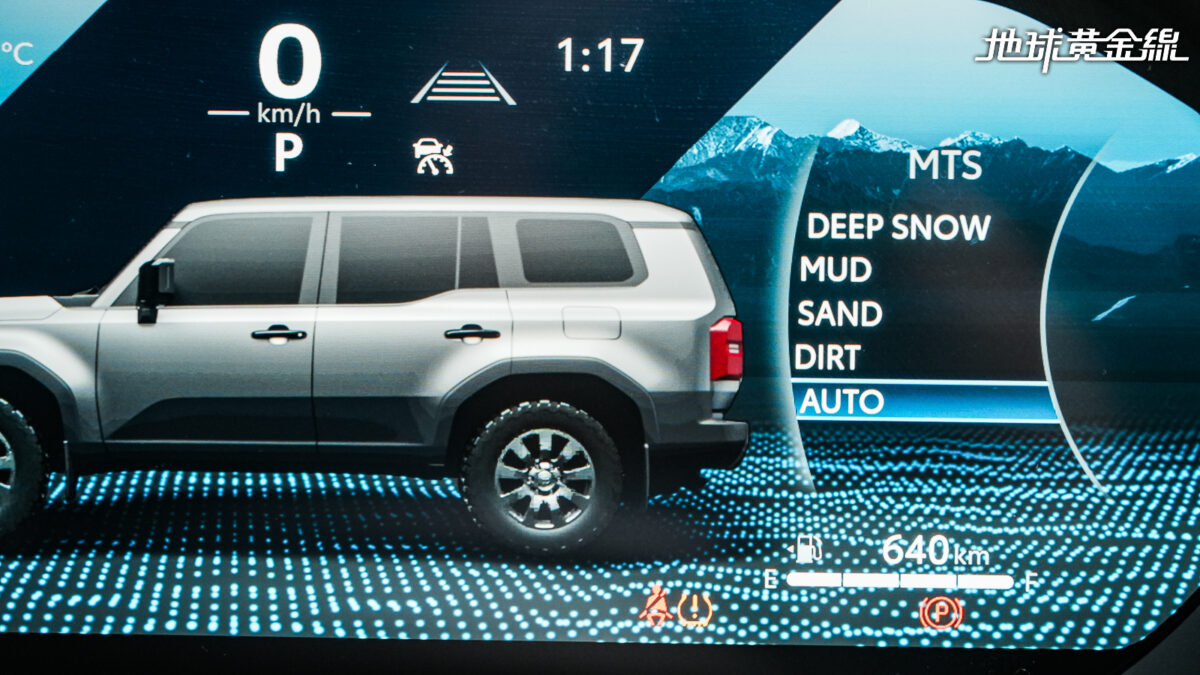 除此之外,Land Cruiser同時配備大量越野所需的便利功能以及模式調整系統,不但標配PVM環景顯影系統,同時整合MTM智慧型越野顯示幕,擁有底盤透視功能,且可顯示車輛的前後俯仰、左右側傾角度數值,以及前輪轉向角度狀態,並可針對車輛邊界加強顯示,更清楚掌握車輛與環境間的關係。而在駕駛模式選擇系統之外,也加入具有多種地形選擇的MTS智慧越野地形系統、陡坡緩降、越野緩進輔助,還有中央差速器鎖定等,並於前軸植入電控防傾桿分離裝置,期望建立一定水準的地形穿越能力。