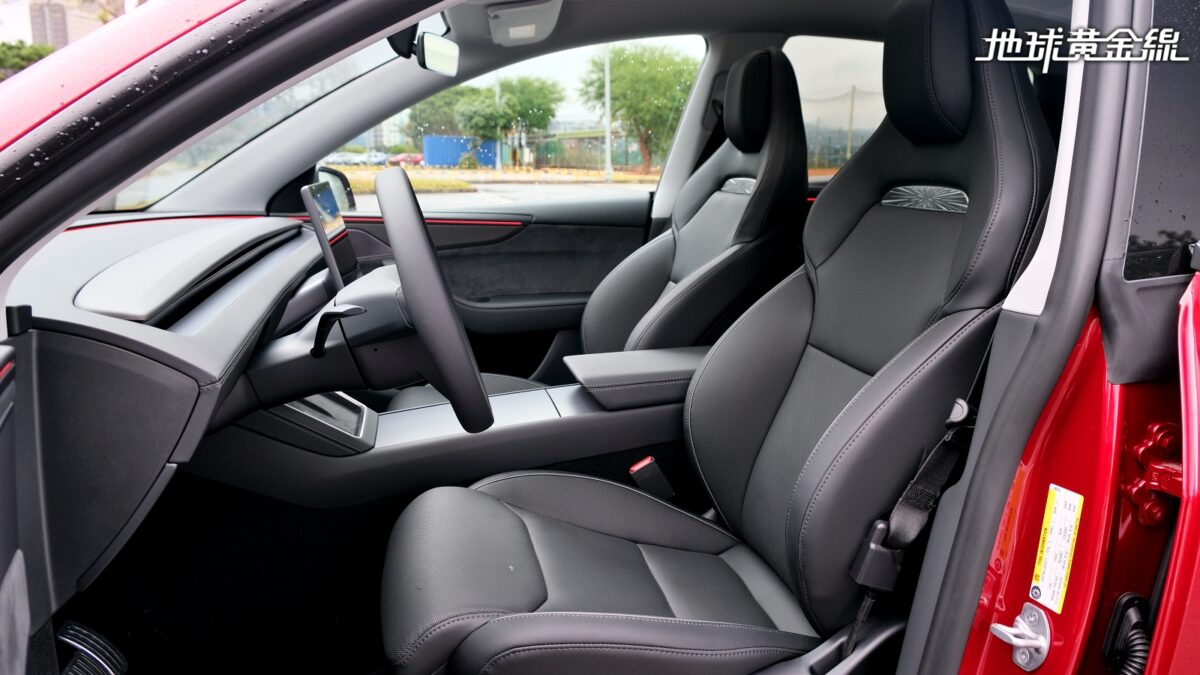 進入座艙區域,Performance車型除了延續新款Model Y的內裝設計架構,還透過一些運動化元素來強化熱血氛圍。像是中控儀表跟前後門板上的布質飾板改為碳纖維飾板,周圍一樣帶有可自訂顏色的256色環艙氣氛燈,雙前座更換上跑車化座椅,不僅保留通風加熱功能還新增電動調整腿托,加以提升大腿支撐性,側邊包覆性也同步加強,一坐上去就有種身體被抱住的安心感,回頭看著頭枕下方的Performance立體徽飾,再度嗅到濃濃的性能味。