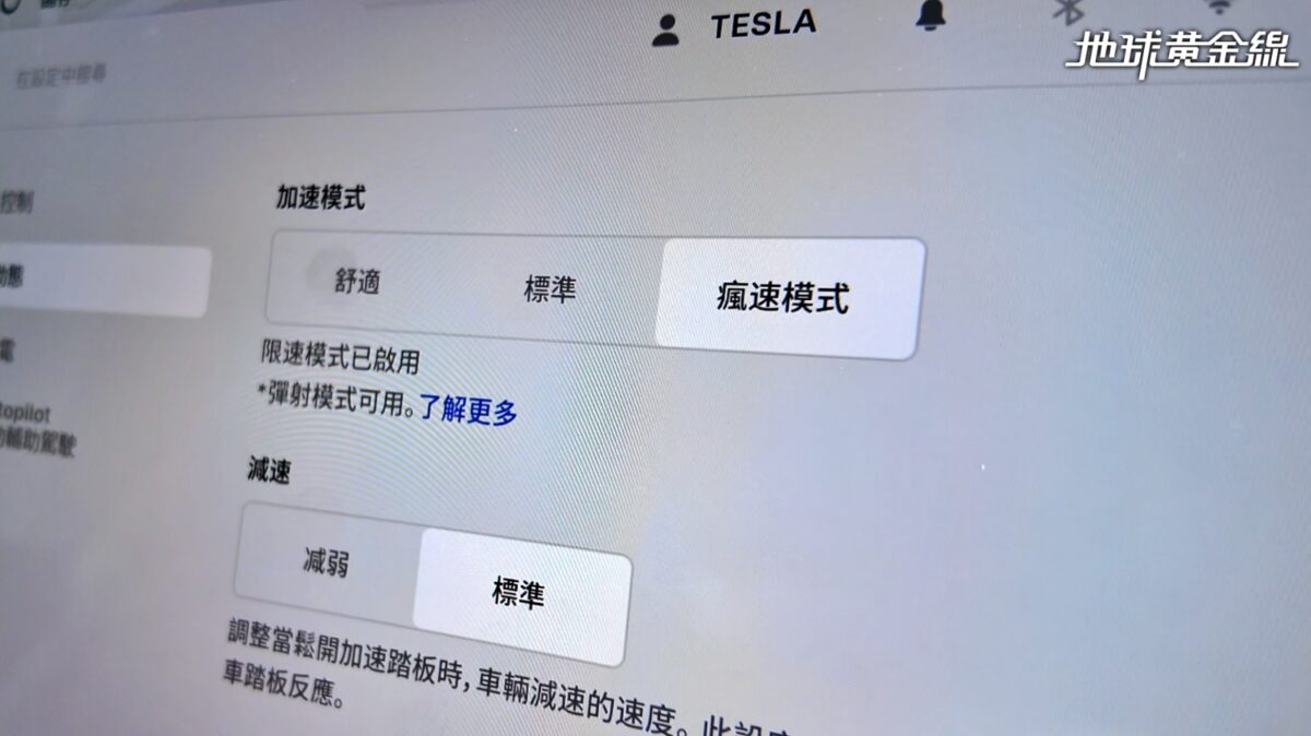 打開加速模式選項可以發現,除了舒適、標準兩種模式外,Model Y Performance還多了瘋速模式,開啟後等同於完全解除動力上的封印,踩下電門馬上有股強勁的推力湧現,接著身體就像被壓在椅背上,直到鬆開右腳後才意識到車速早已超過預期。
